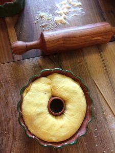 Somehow, mine stayed together and ended up fitting inside the mold. But if the rolls were too long, the extra length was sliced off made into little potica cookies. Before placing the rolled dough inside the mold, we spread a generous amount of melted butter inside to prevent the potica from sticking.
