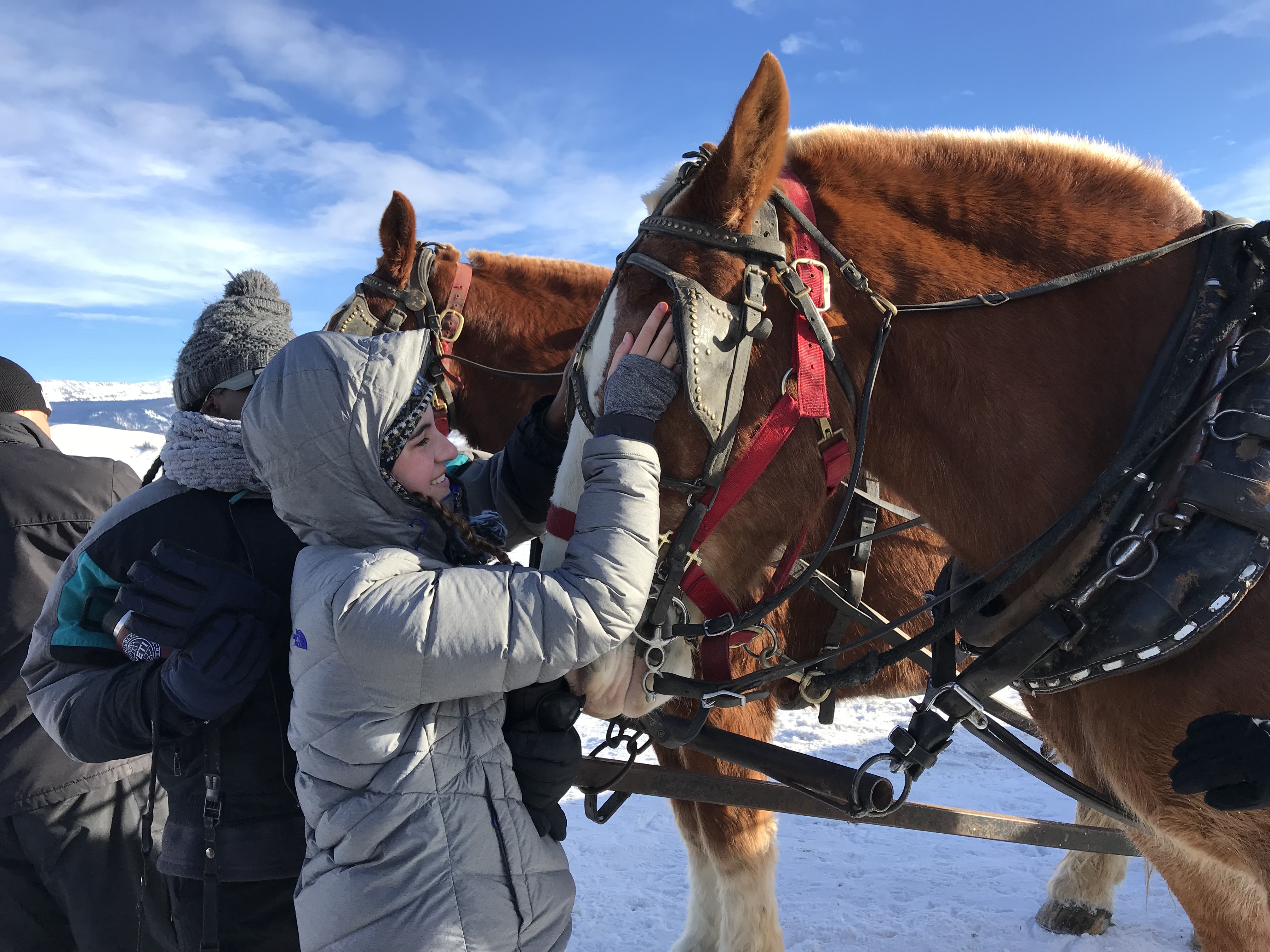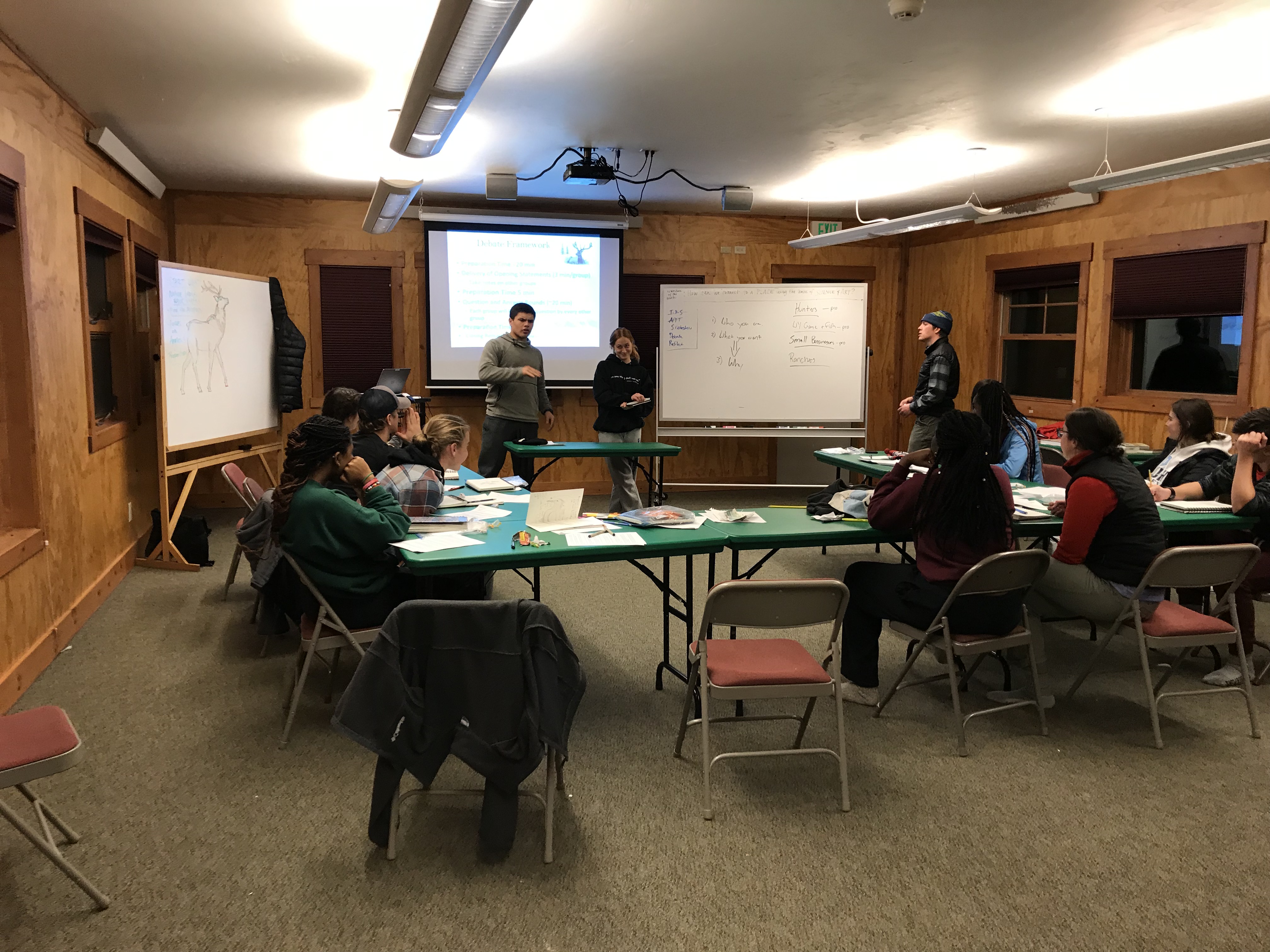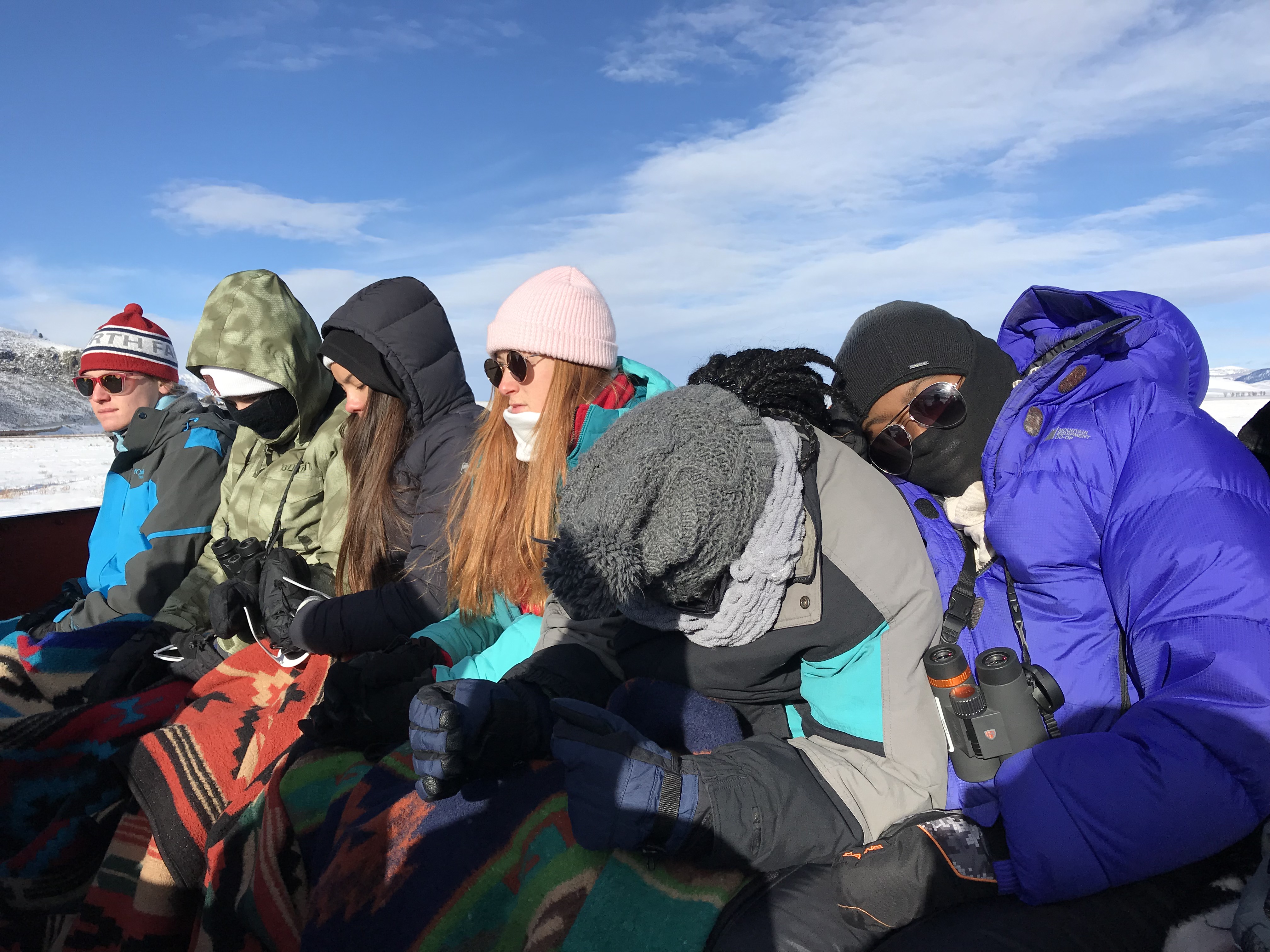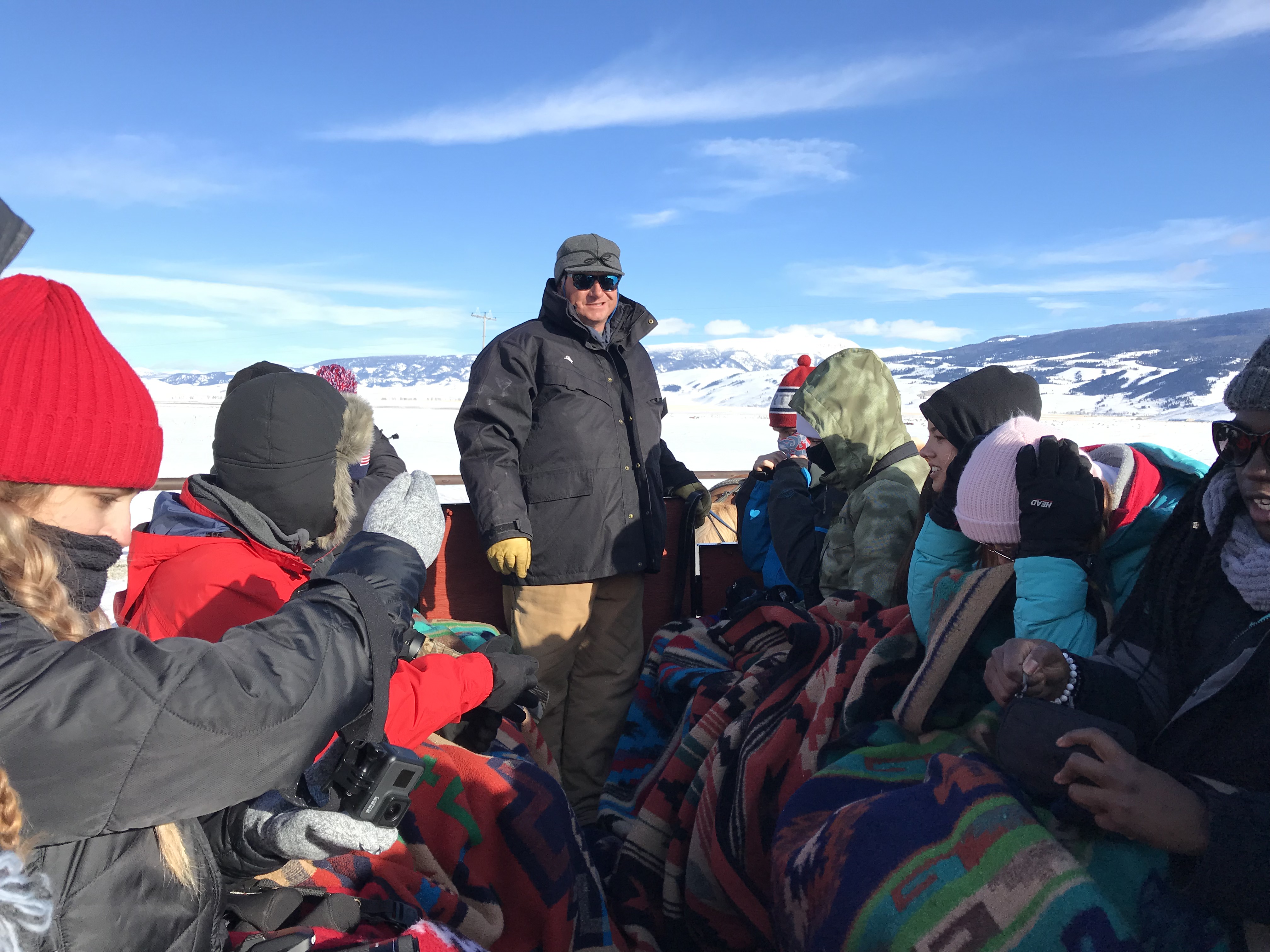 This morning we were greeted by the magnificent Teton range out in all its glory. Sunny day provided clear views and a gorgeous sunrise and sunset. In the morning, we went to the National Wildlife Art Museum and explored the question, “How does art inspired by wilderness contribute to conservation?” It was powerful to see how students identified ethics expressed in works of art. After the museum, we drove to Miller Butte in hopes of seeing big horn sheep. We were not disappointed! Following the exciting finds, we took a sleigh ride at the National Elk Refuge, learning in depth about the controversial topic of feeding the elk. We wrapped up the evening with a fiery (yet very respectful) debate that highlighted each of the stakeholders who are part of this controversial management practice. We sought consensus and some groups found it. Be sure to ask what their thoughts are on feeding the elk and why!