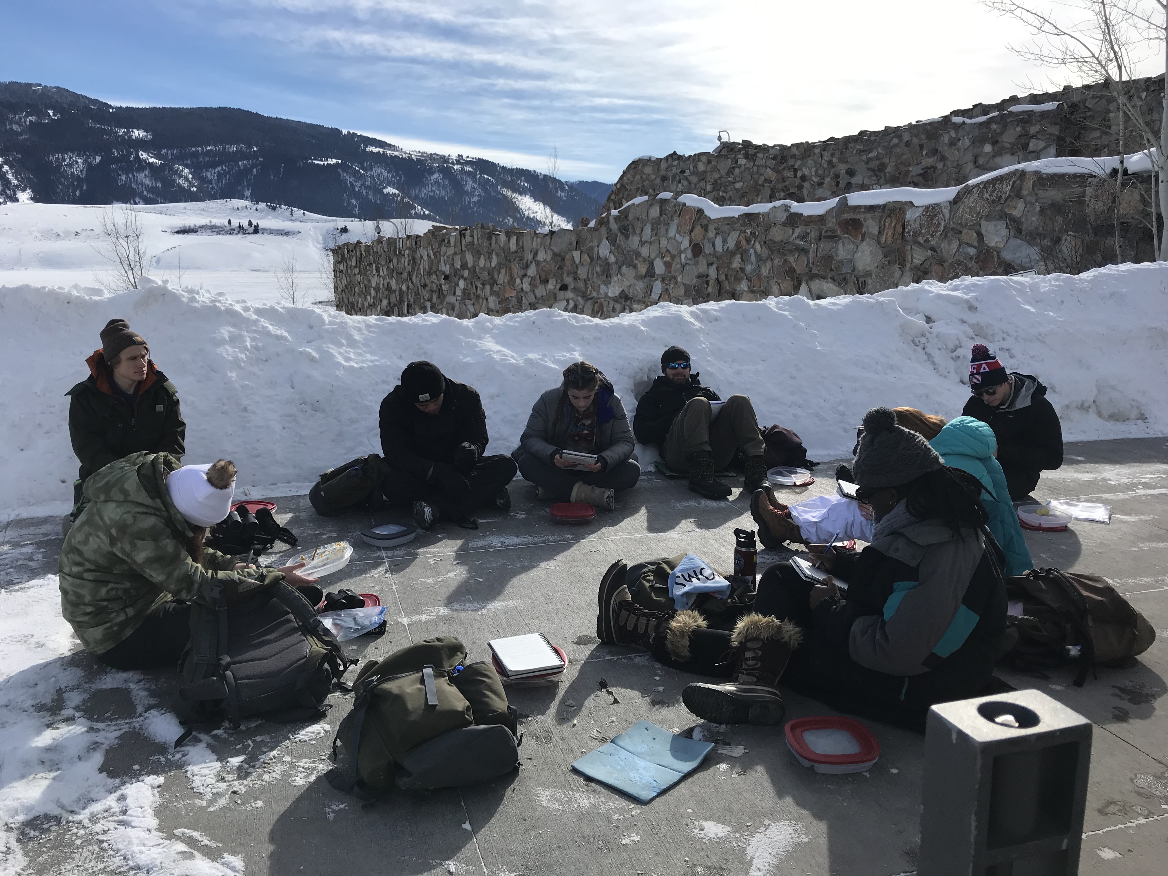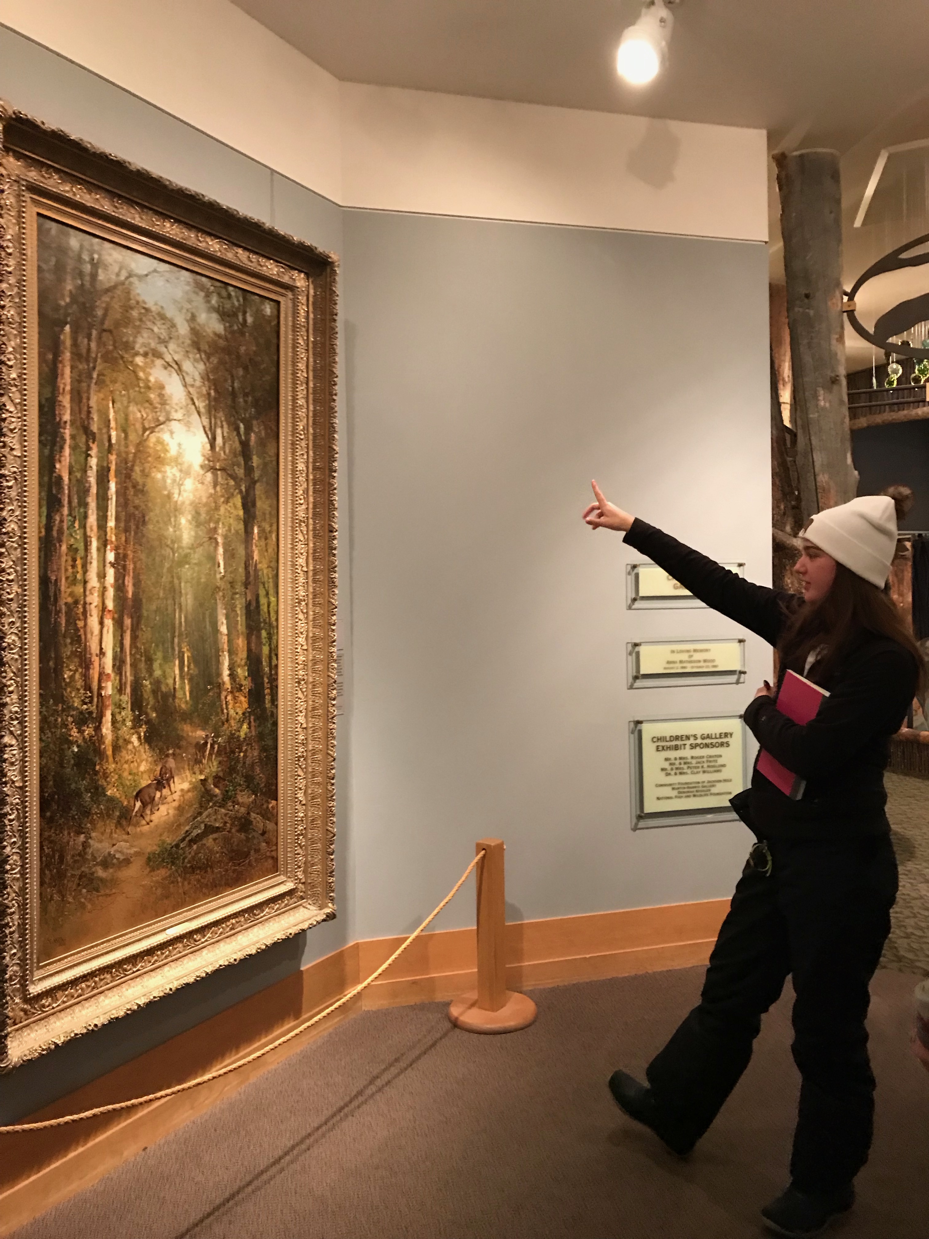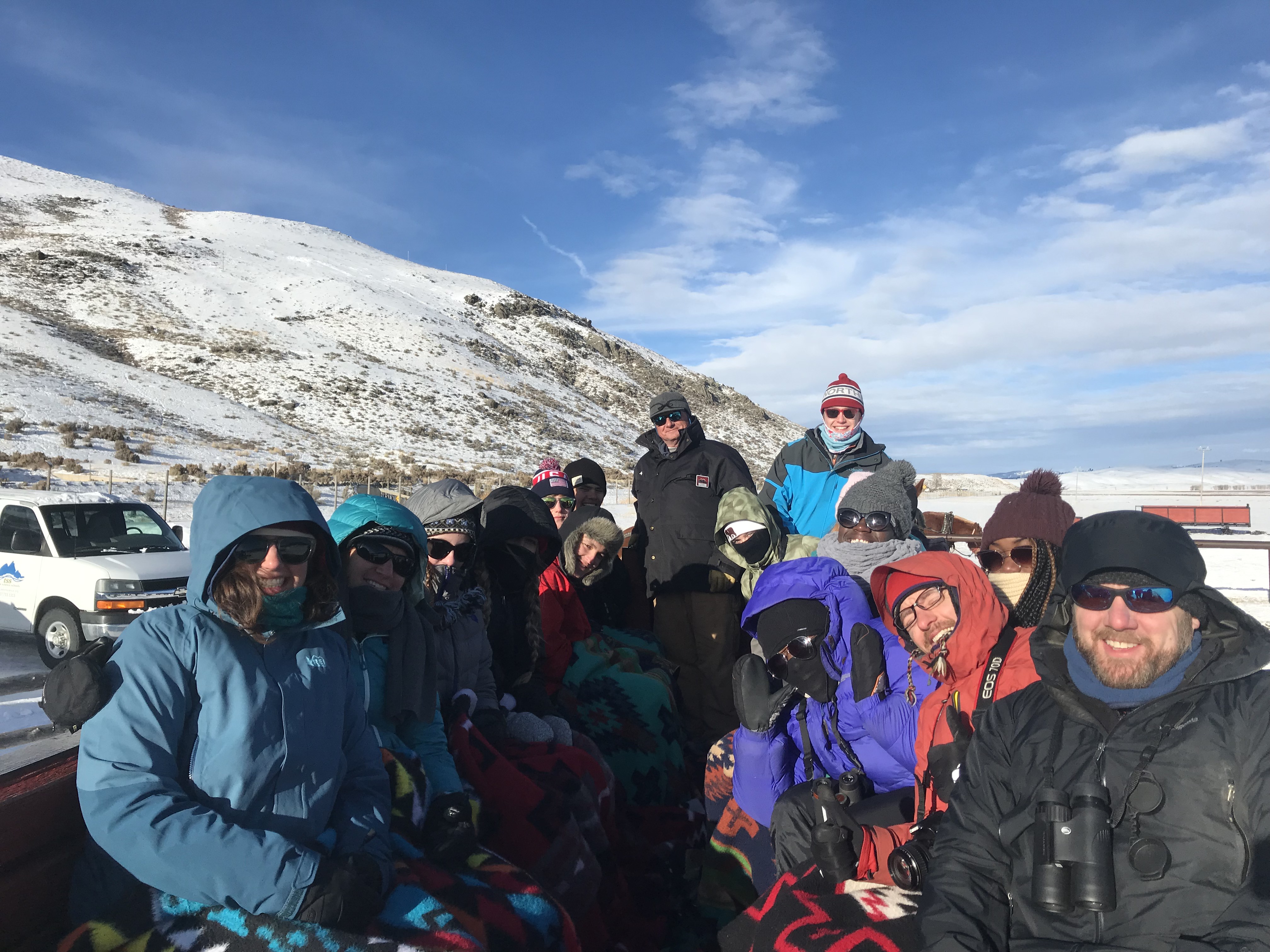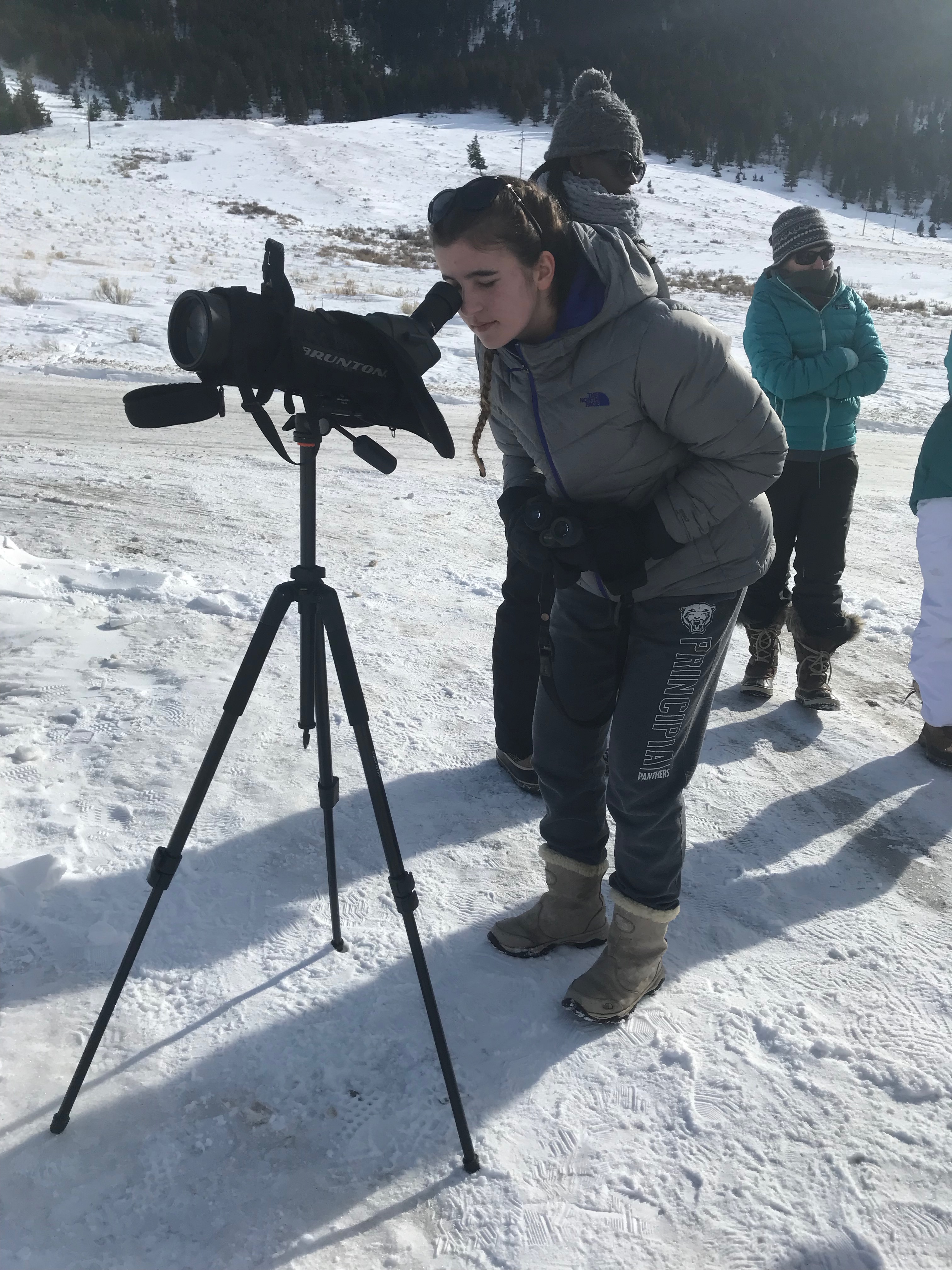 This morning we were greeted by the magnificent Teton range out in all its glory. Sunny day provided clear views and a gorgeous sunrise and sunset. In the morning, we went to the National Wildlife Art Museum and explored the question, “How does art inspired by wilderness contribute to conservation?” It was powerful to see how students identified ethics expressed in works of art. After the museum, we drove to Miller Butte in hopes of seeing big horn sheep. We were not disappointed! Following the exciting finds, we took a sleigh ride at the National Elk Refuge, learning in depth about the controversial topic of feeding the elk. We wrapped up the evening with a fiery (yet very respectful) debate that highlighted each of the stakeholders who are part of this controversial management practice. We sought consensus and some groups found it. Be sure to ask what their thoughts are on feeding the elk and why!