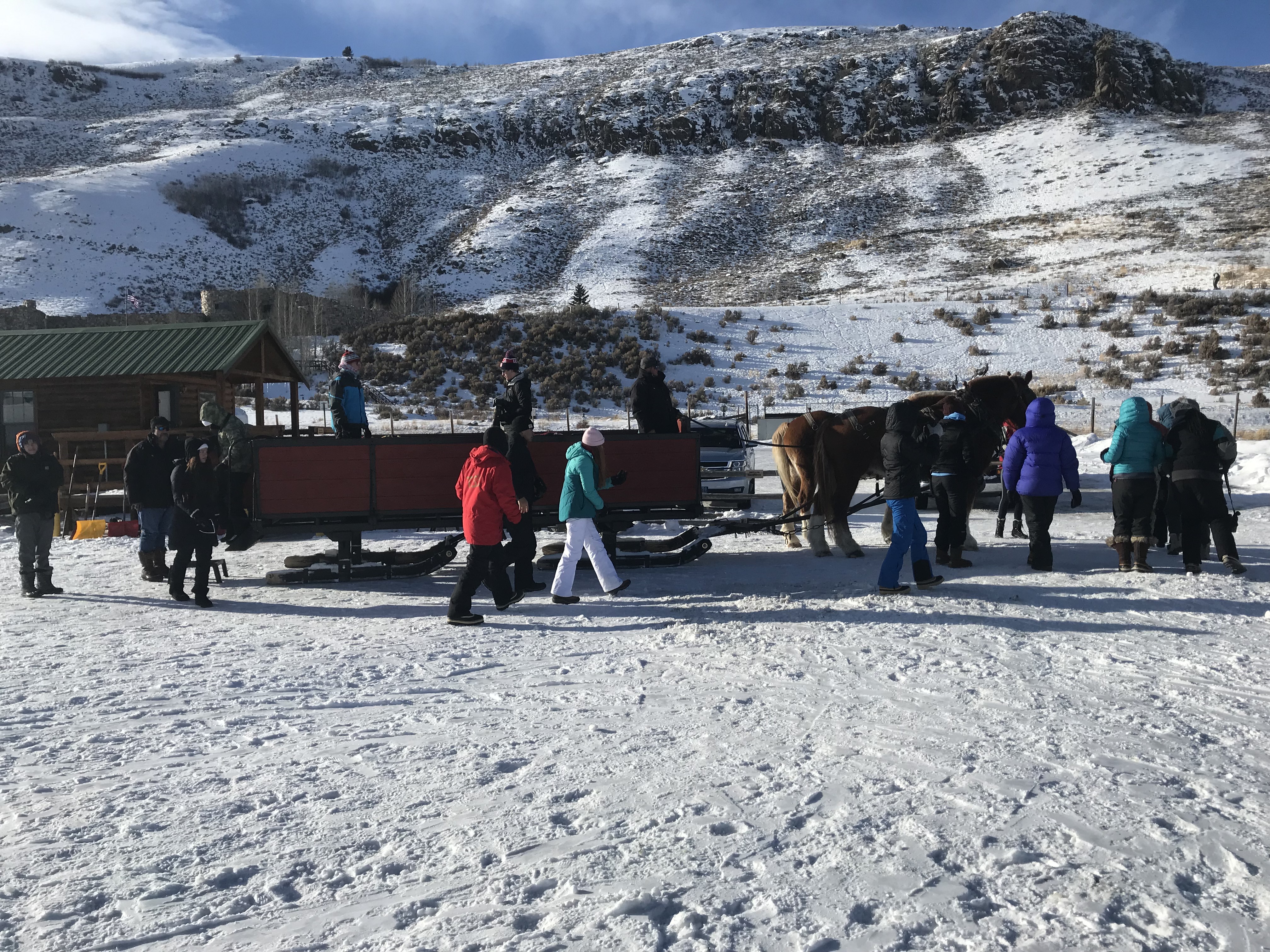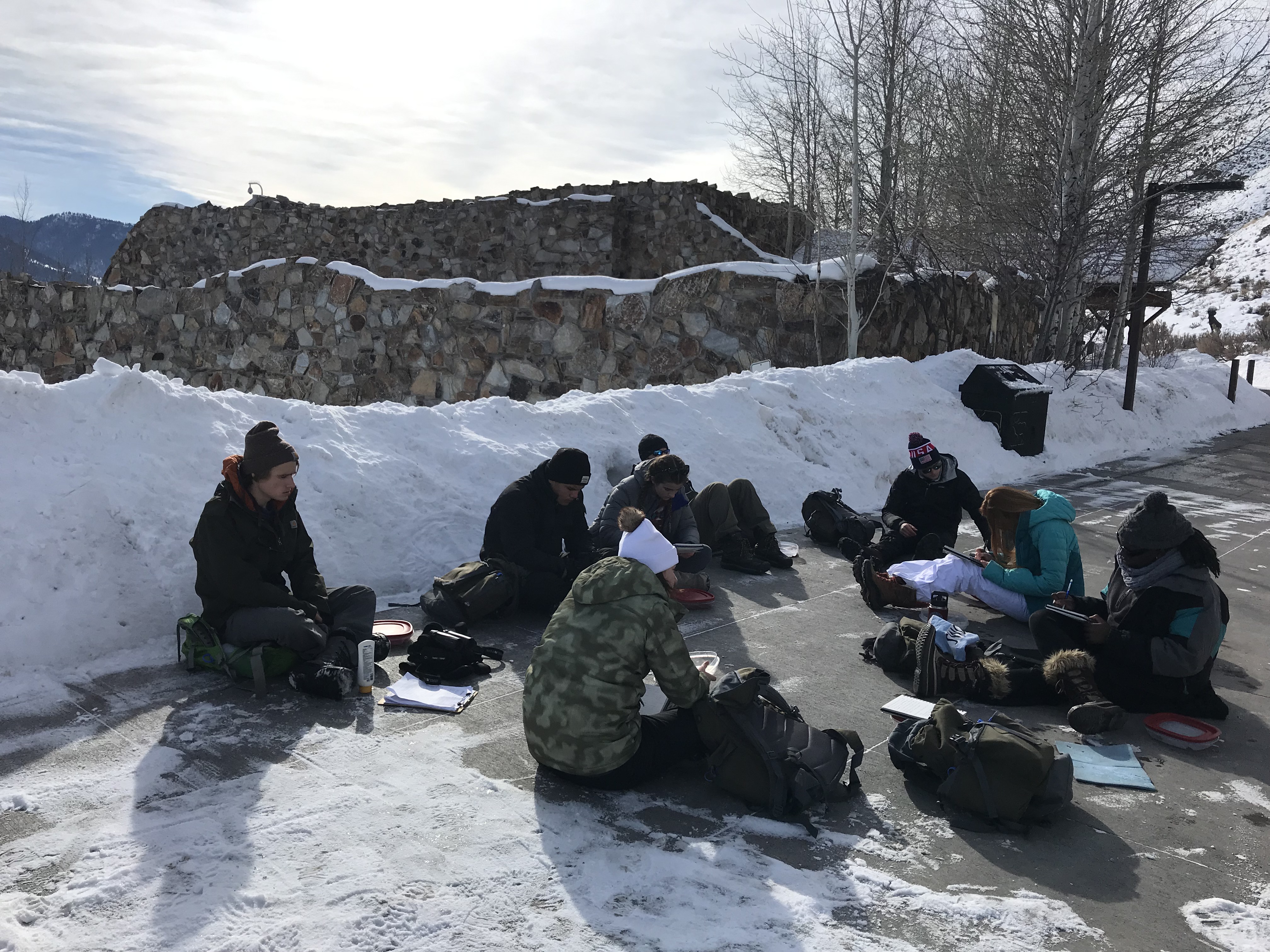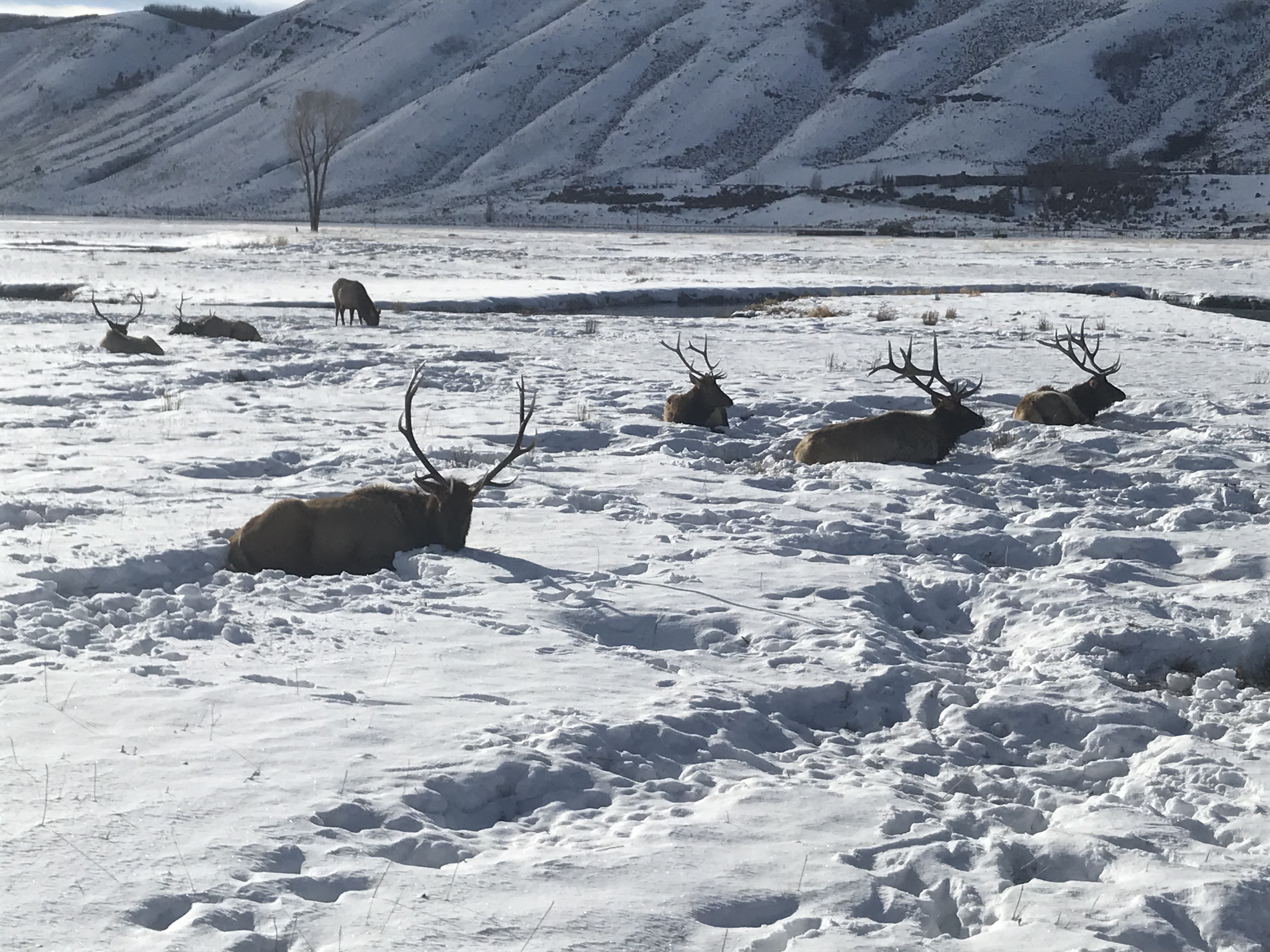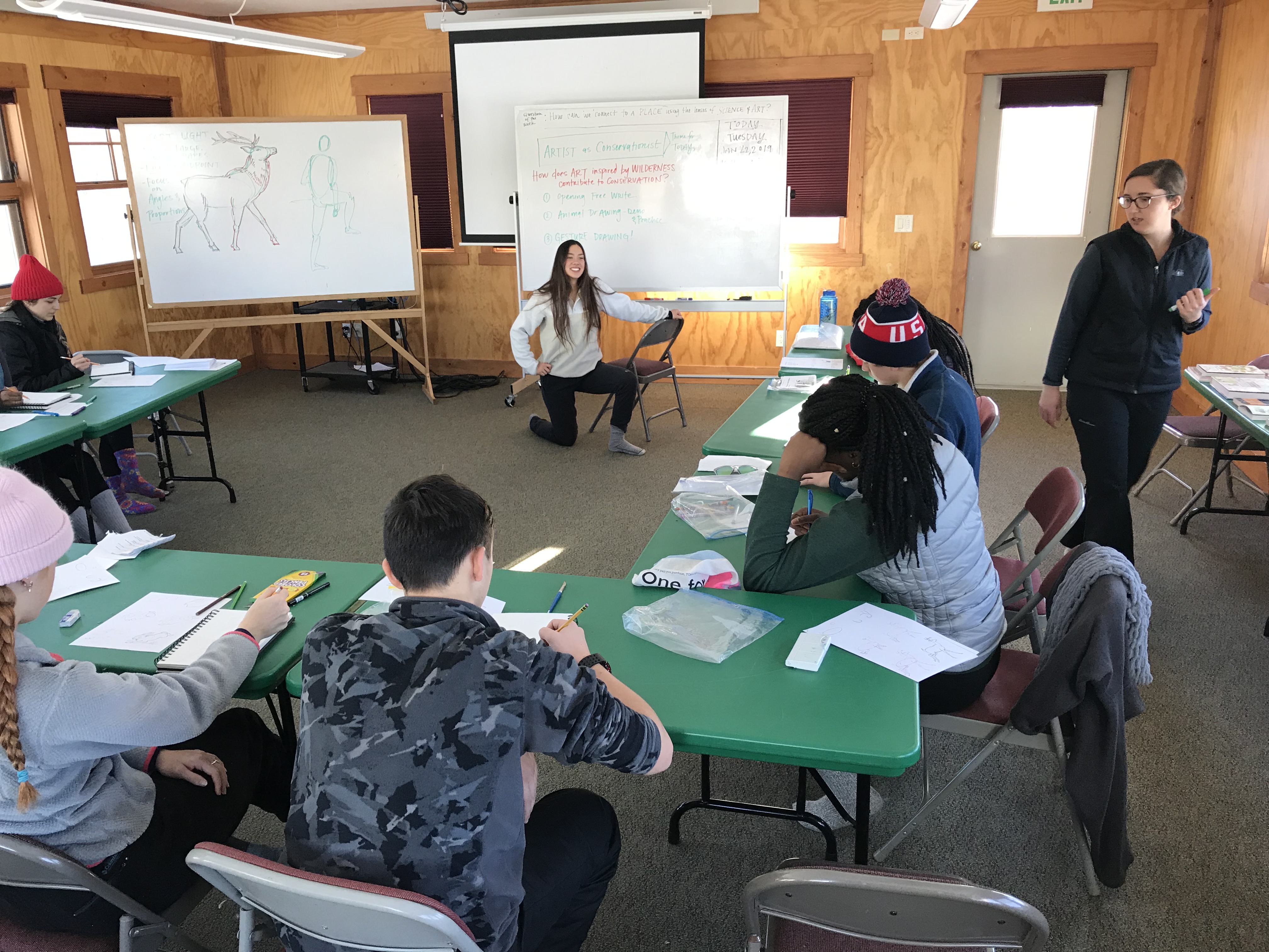 This morning we were greeted by the magnificent Teton range out in all its glory. Sunny day provided clear views and a gorgeous sunrise and sunset. In the morning, we went to the National Wildlife Art Museum and explored the question, “How does art inspired by wilderness contribute to conservation?” It was powerful to see how students identified ethics expressed in works of art. After the museum, we drove to Miller Butte in hopes of seeing big horn sheep. We were not disappointed! Following the exciting finds, we took a sleigh ride at the National Elk Refuge, learning in depth about the controversial topic of feeding the elk. We wrapped up the evening with a fiery (yet very respectful) debate that highlighted each of the stakeholders who are part of this controversial management practice. We sought consensus and some groups found it. Be sure to ask what their thoughts are on feeding the elk and why!